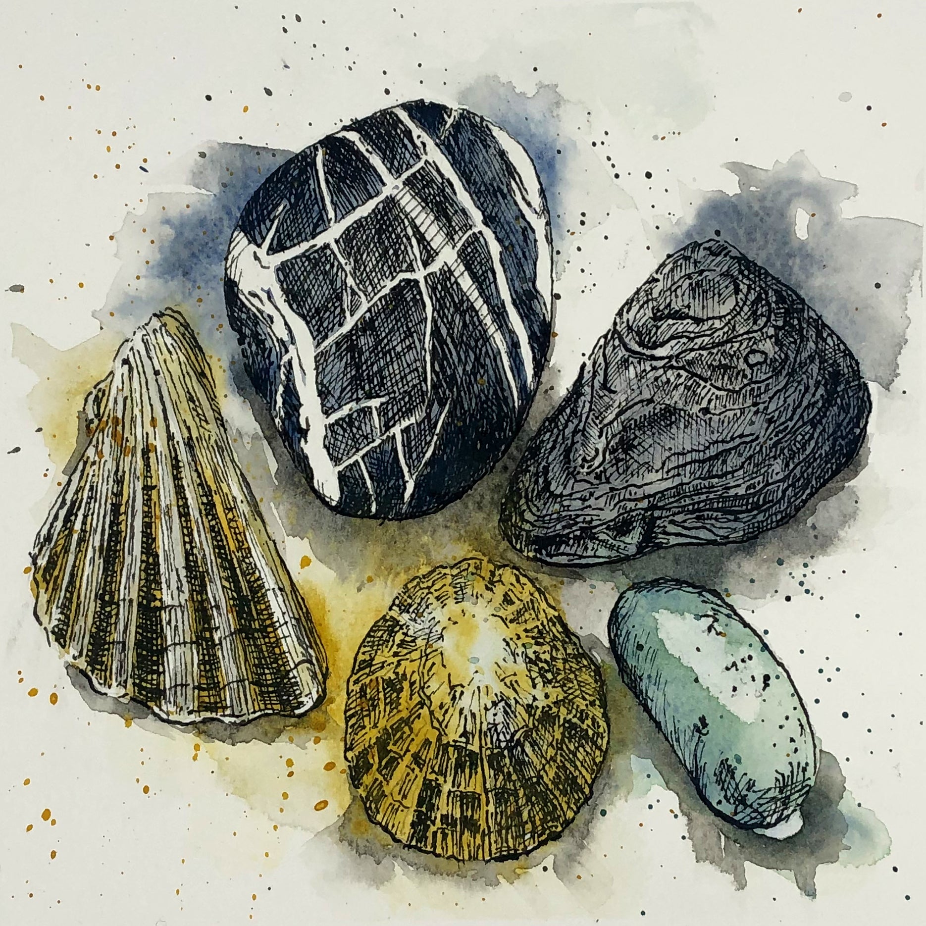 In January 2021, whilst in the middle of a Covid-19 lockdown, I did the '30 day sketchbook challenge' and one of the prompts was 'In my pocket' which set me thinking about walks along beaches and idly picking up shells and stones which weigh down my pockets and end up in small piles on windowsills at home.